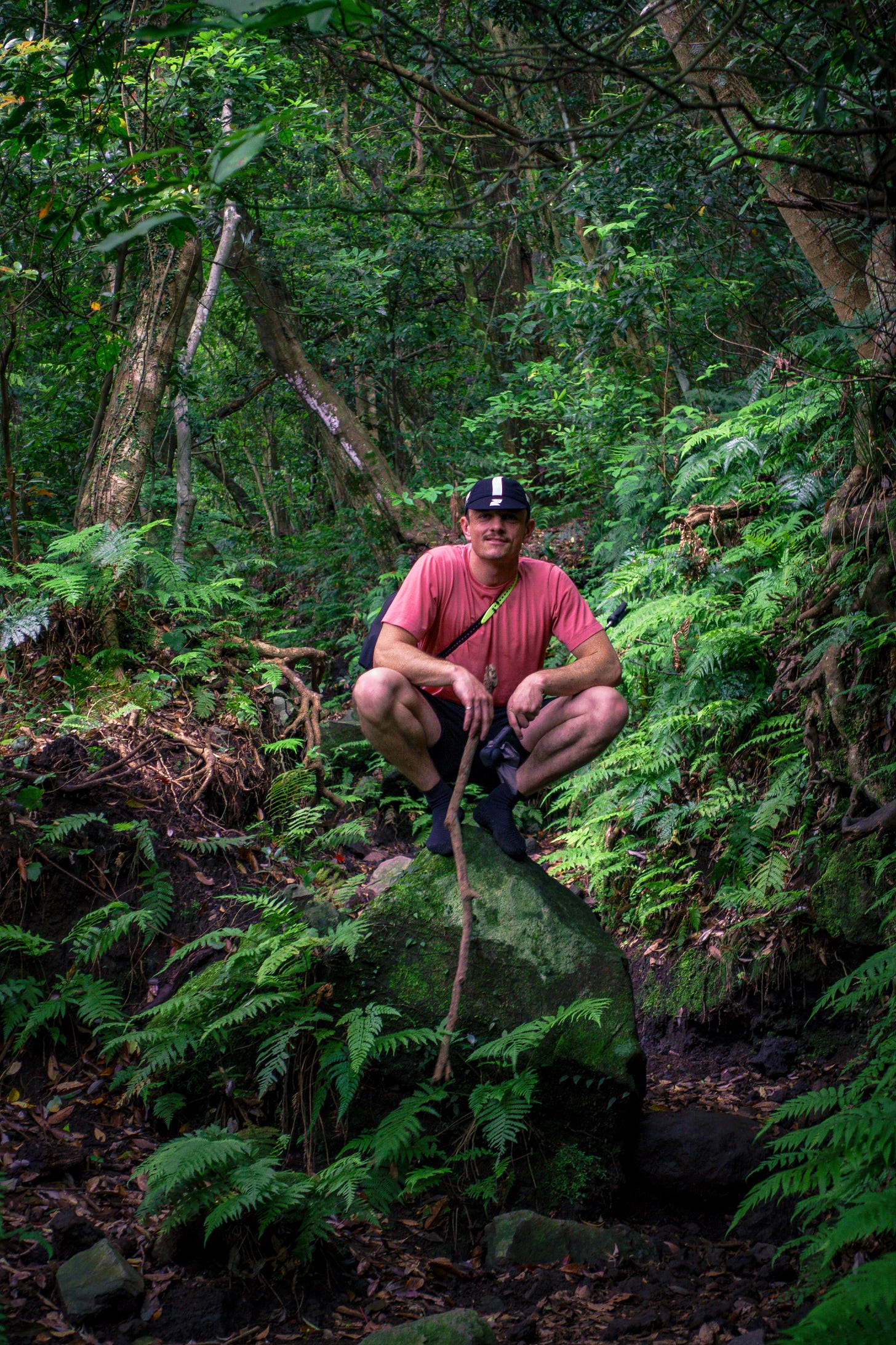 The climb took about three hours all in. Cycling shorts are not the most comfortable for hiking, but the collection of preloved walking sticks at the trailhead was a nice touch. The path was well-trodden volcanic rock and large boulders, with a healthy abundance of Cretaceous vegetation: big ferns and heavy sheets of moss clinging to every damp surface. The air was humid, tropical.