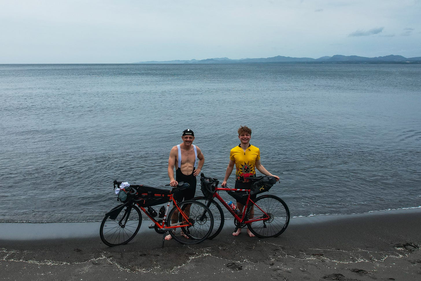 Our final task before we could begin the cycle proper was to dip our wheels in the sea. It was now 2 pm and we had about 60 km to get to Kagoshima. After a quick swim, we packed everything onto our bikes and struck out north through a landscape of newly planted rice paddies and dormant volcanoes.
