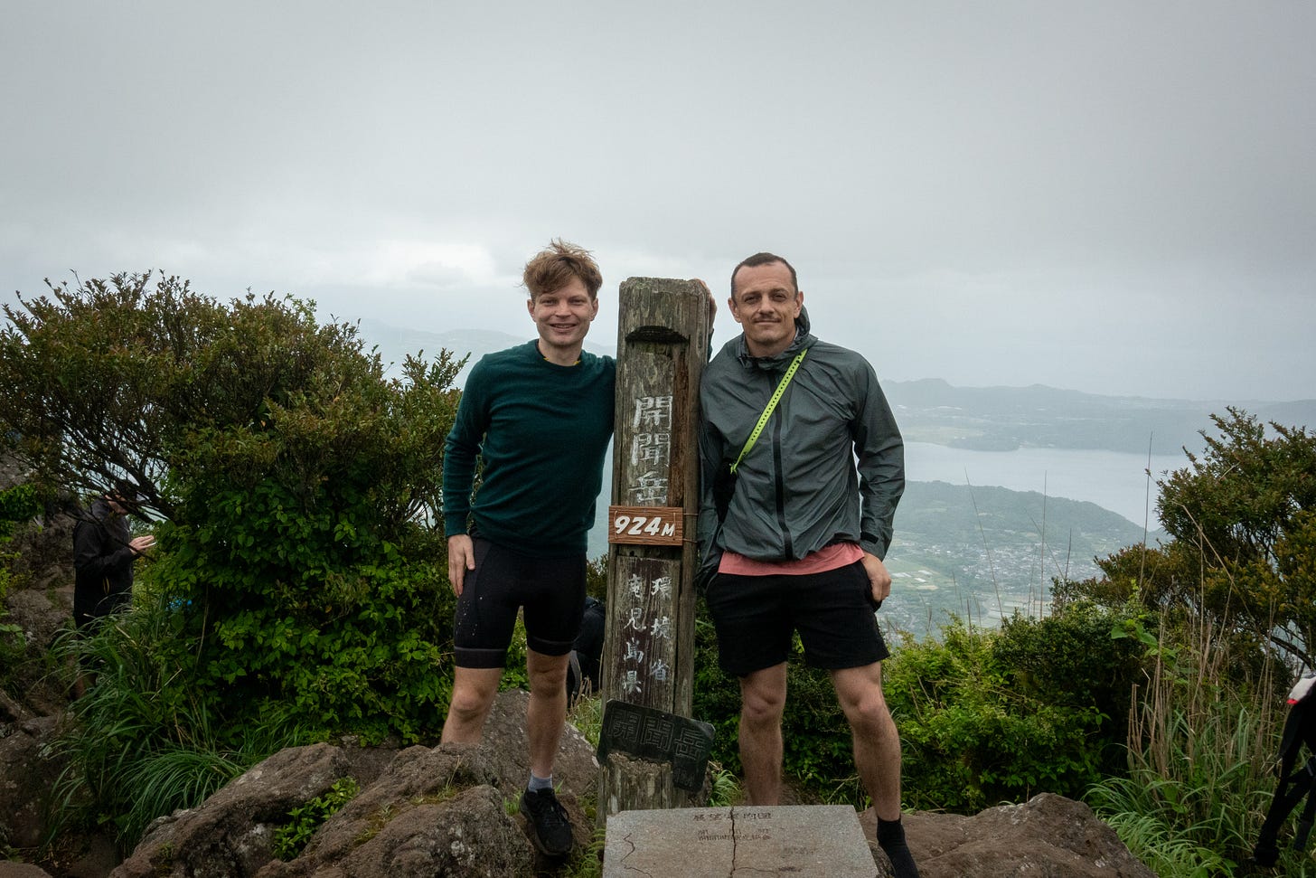 Thick cloud roled in on a fast wind as we approached the summit. A cheery lady at the start told us it might rain, so we didn’t spend long at the top — enough time for a couple of onigiri each (tuna-mayo and spicy mustard greens, a Kyushu favourite). We had reached our starting line, 924 meters up. To the north, 3,000 kilometres away, our finish. If the weather had been kinder, this might have been a moment of grander reflection about the journey ahead. Instead, we hurried down the mountain to the warmer flats below.