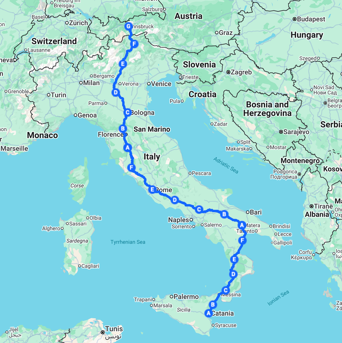 Here’s the outline of the route: We start in Catania on Sicily, head northeast to Matera, then to Rome, Siena, Florence, Bologna, Trento, Bolzano and then finish in Innsbruck, Austria. There’s an interactive map, here.